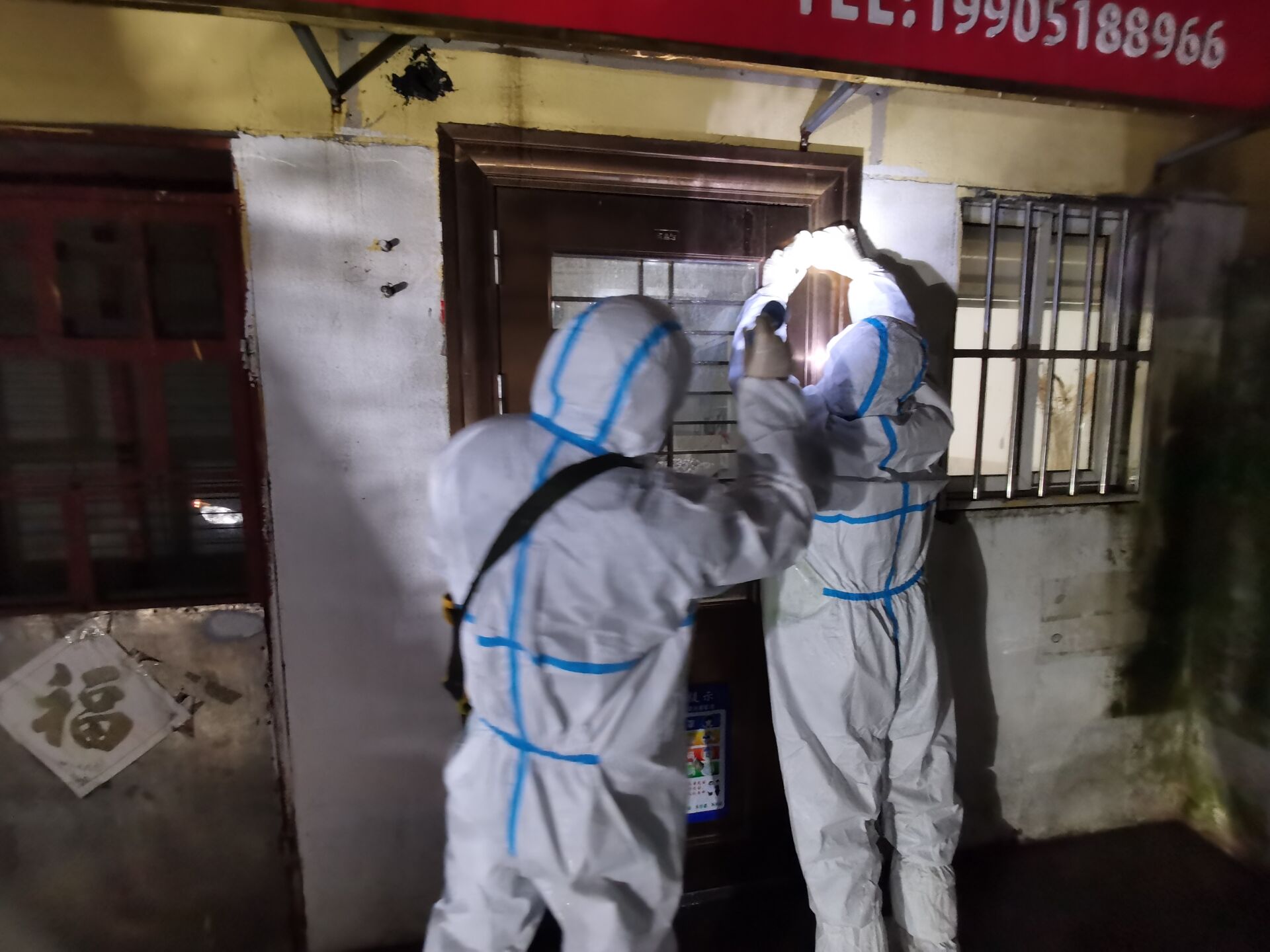 由于新橋社區(qū)多為自建房,門牌號混亂難找,房地產(chǎn)和資產(chǎn)公司的志愿者們冒雨堅守,逐戶排查登記信息,宣傳防護(hù)知識,講解防控要求,并對重點監(jiān)控住戶安裝防疫門磁。