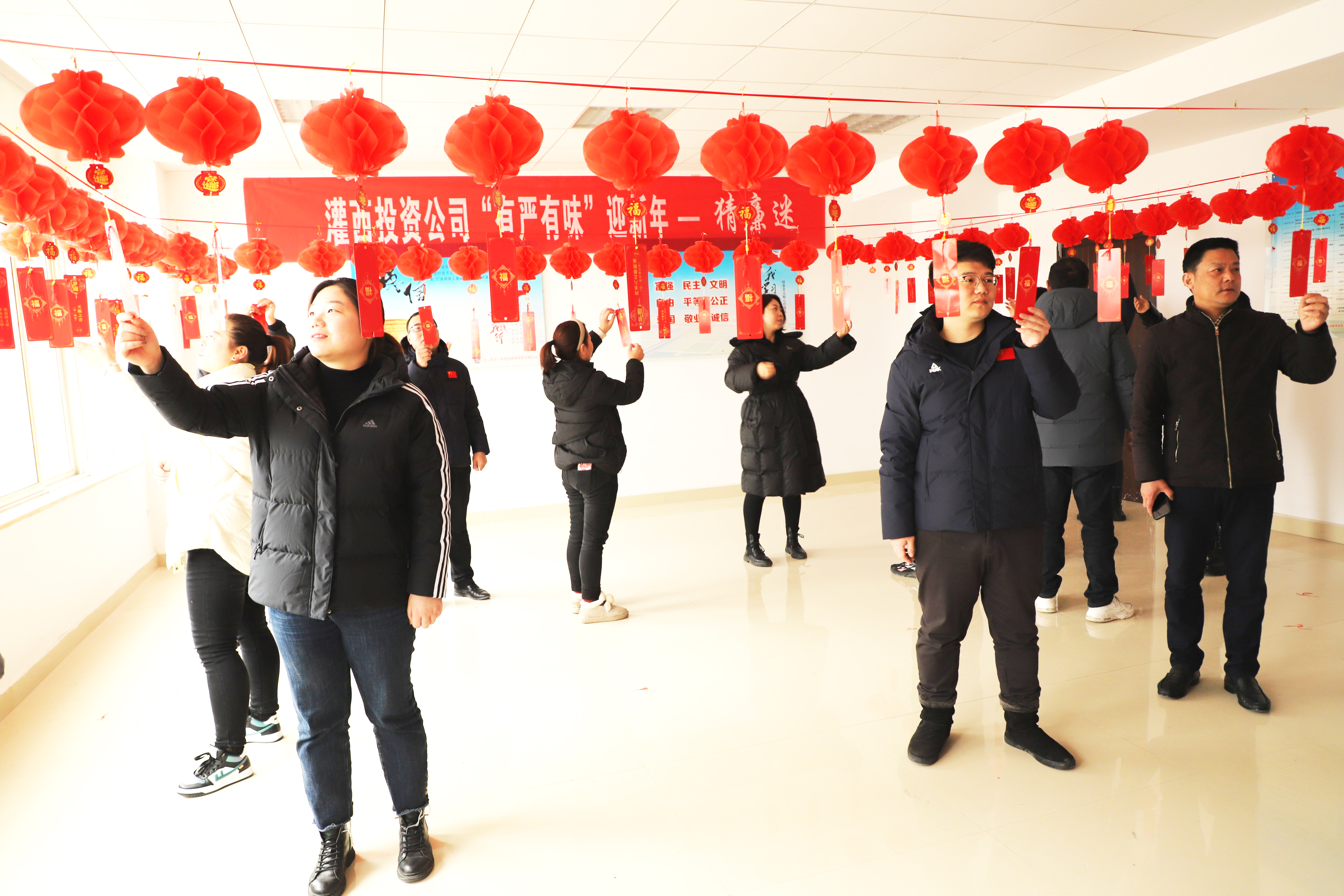 “樹我中華廉政風——打我國兩節氣。”“反腐倡廉常抓不懈——打一中國地名。”1月26日,灌西公司辦公大樓廉政文化展廳內紅紅的燈籠格外喜慶,近百條廉政燈謎依次懸掛,一場集知識性和趣味性于一體的廉政燈謎有獎競猜活動吸引了百余名員工聚集參與,大家一起開動腦筋,爭相“解密”。