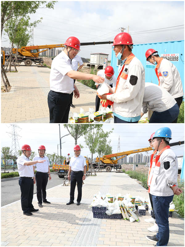 7月28日上午,集團公司黨委副書記戴鴻鳴、工會主席劉承志一行,深入公司施工一線走訪慰問職工,把綠豆、牛奶等防暑降溫用品送到他們手中,在炎炎夏日,為一線職工送去集團公司的深切關懷。 在臺北工地,戴書記與施工人員親切交談,簡要了解了工程的施工情況,叮囑他們在夏日高溫期間要注意安全,做好防暑降溫措施,確保安全生產和身體健康。(電宣)