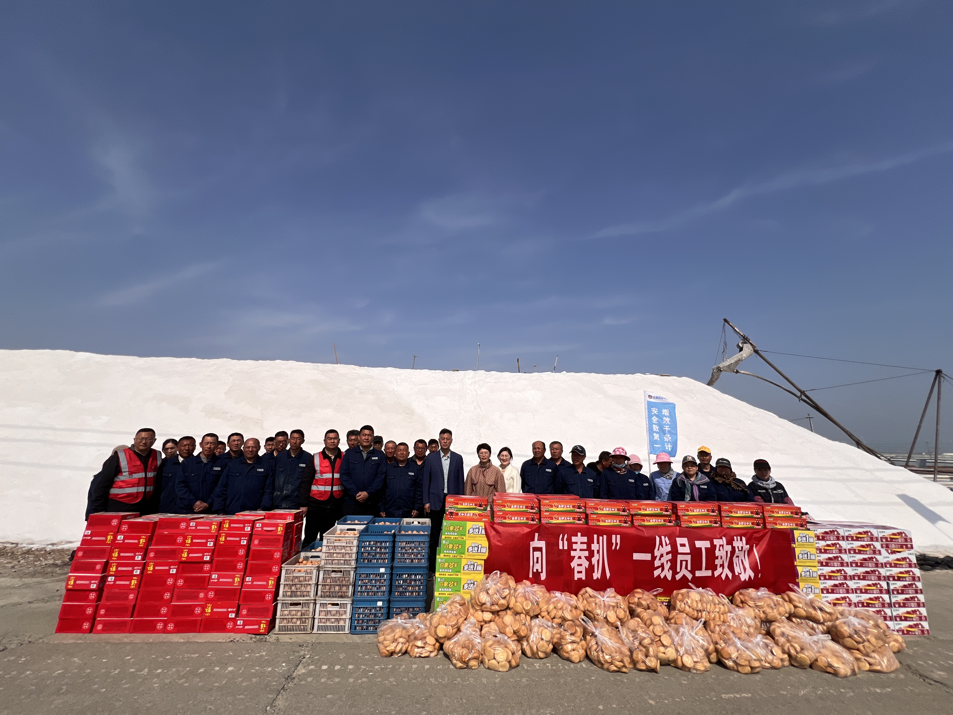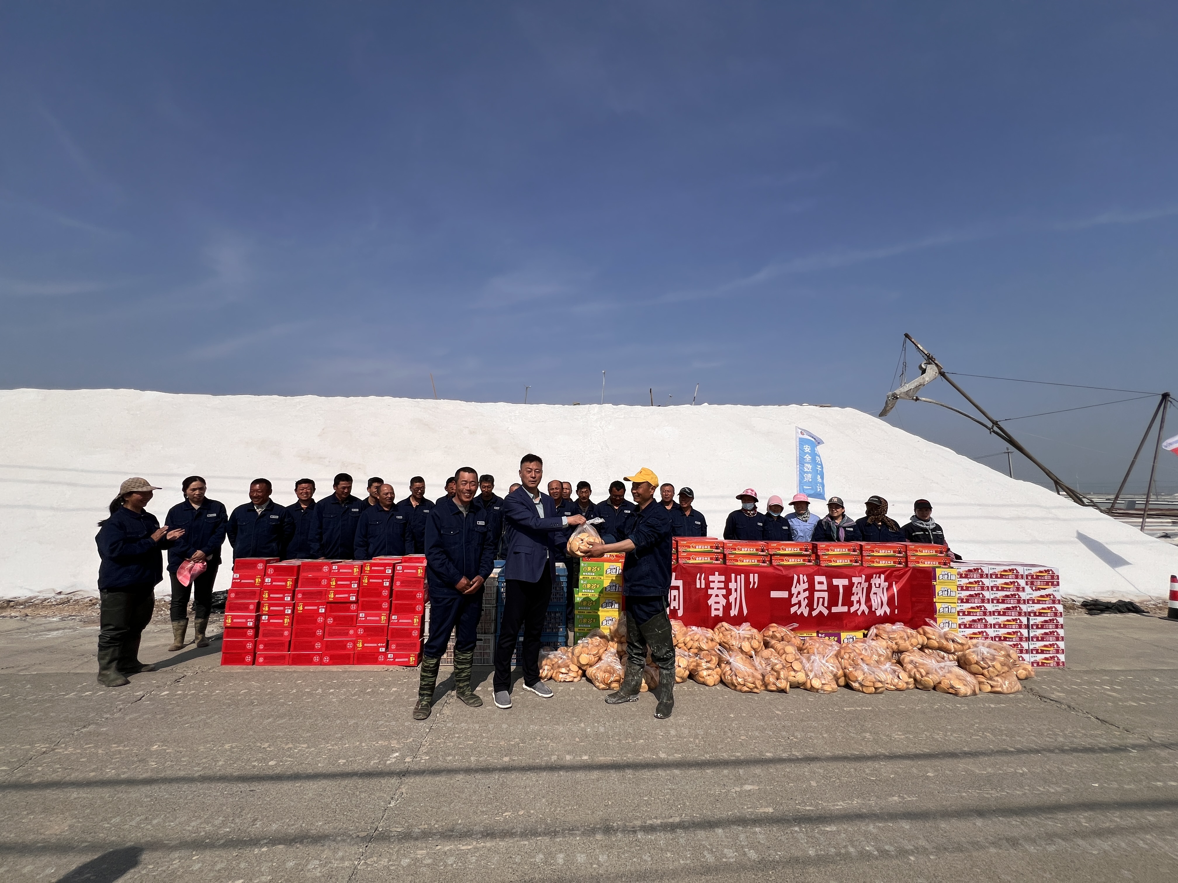 “你們辛苦了,我代表公司來看望大家。”在新河十班與埒南十一班,吳衛平與扒鹽現場職工握手問好,感謝他們在過去的一年為日曬制鹽公司的原鹽生產所付出的辛勤努力,叮囑他們一定要落實落細扒鹽生產措施,增強責任感和警覺性,嚴格執行各項規章制度,切實保障扒鹽期間的安全生產,并送上雞蛋、八寶粥、方便面、牛奶等物品。