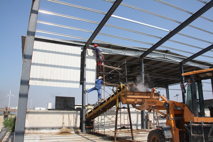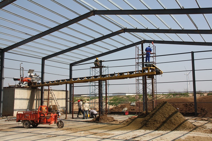 5月18日,位于北北歐農(nóng)莊生豬養(yǎng)殖廠旁邊的綠淮肥業(yè)公司有機(jī)肥生產(chǎn)基地,一個(gè)鋼結(jié)構(gòu)廠房即將完工,只見機(jī)聲轟鳴、焊花飛濺,機(jī)電服務(wù)公司的工人在勞模王緒華帶領(lǐng)下正在焊接鋼結(jié)構(gòu)件,而正在建設(shè)施工中的廠房內(nèi),兩條有機(jī)肥生產(chǎn)線運(yùn)轉(zhuǎn)不停,沒有因廠房建設(shè)而停產(chǎn),廠房旁邊的一臺挖掘機(jī)正在整平場地,一邊建設(shè),不邊生產(chǎn),一派紅火景象。