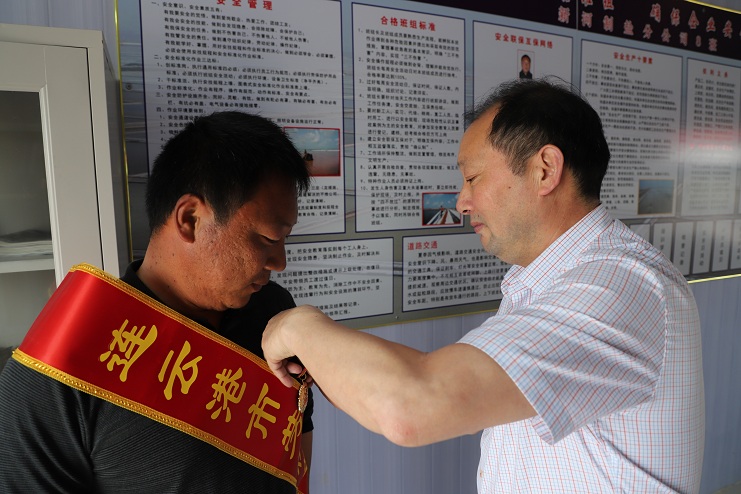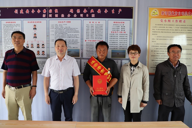 5月22日下午,公司董事長、黨委書記李國文、紀委書記、工會主席王宏一行到新河制鹽分公司八班為獲得連云港市勞動模范的祝星星綬帶佩章。