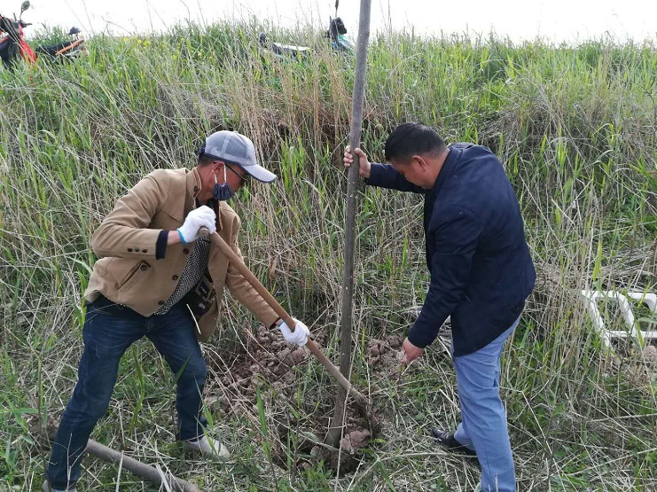 大家下午一點三十出發,每人帶上鐵锨或者鐵楸,前往目的地。全體員工都相互協作,四人一組搬運樹苗,填土栽植,經過兩天的勞動完成了二百三十三畝土地共五百四十棵樹苗的栽植任務。