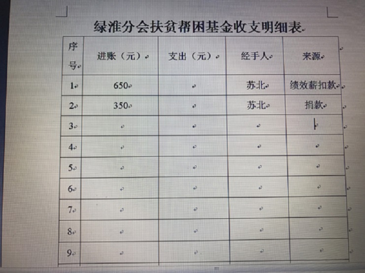 7月27日,綠淮公司出納將1000元現金匯入專有賬戶,標志著分會成功引入第一筆扶貧基金。