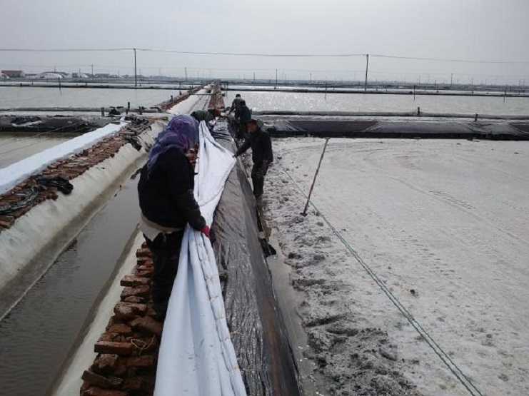 新河制鹽分公司為了盡快改善食用鹽基地面貌,減少池埝上固化紅磚風(fēng)化,沙塵落入鹽池內(nèi),對(duì)池鹽的污染,近期組織分公司職工,對(duì)基地塑池的紅磚固化池埝進(jìn)行處理,先用黑塑布把池埝重包一遍,然后再用土工布苫好。有效地減少了雜物落入池鹽中,為產(chǎn)合格食用鹽提供了良好生產(chǎn)環(huán)境。(圖為職工們正在苫蓋紅磚固化池埝。) (唐廣付)