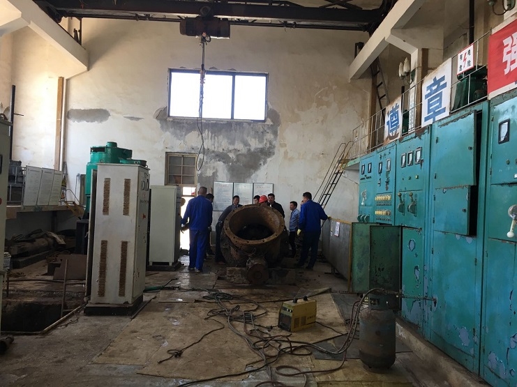近日高溫高蒸發,全場海水養殖區海水需求量變大,養殖池塘水位連續告急,另六圩閘閘站五號機泵的水葉老化,出水量變小,導致工作效率降低,不能滿足日常的工作要求。于是副經理孫曉波帶領資源管理公司人員配合生產部機修人員對六圩閘機泵進行搶修,為了趕在潮水之前爭取把水葉搶修好,大家擼起袖子加油干,有人開行車、有人拿撬棒、有人拿大錘、有人拿特制大扳手、有人拿電焊槍等,大家齊心協力各有分工,終于完成吊泵和水葉拆卸、安裝等,現場出現一片繁忙的景象。為能夠早日修好機泵,保證正常供水,十余人起早貪黑在六圩閘站的大機房努力搶修著。