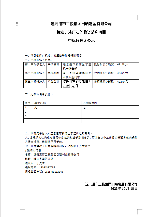 連云港市工投集團(tuán)日曬制鹽有限公司 機(jī)油、液壓油等物資采購項(xiàng)目中標(biāo)候選人公示