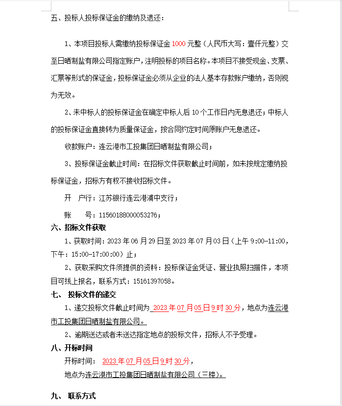 連云港市工投集團日曬制鹽有限公司軸承等物資招標公告