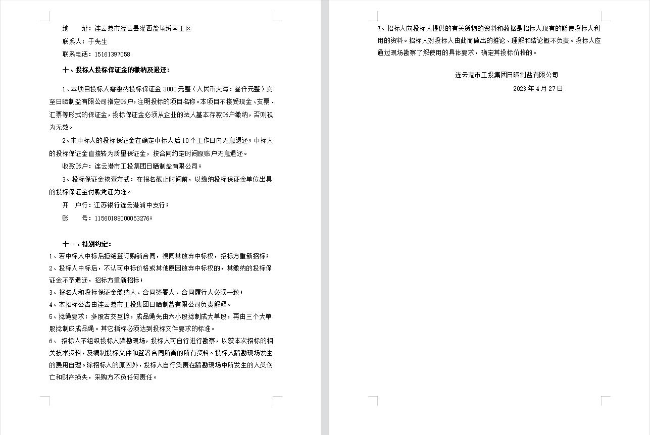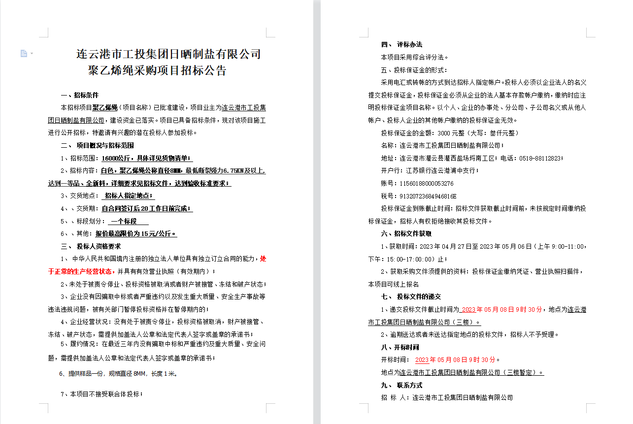 連云港市工投集團日曬制鹽有限公司聚乙烯繩采購項目招標(biāo)公告