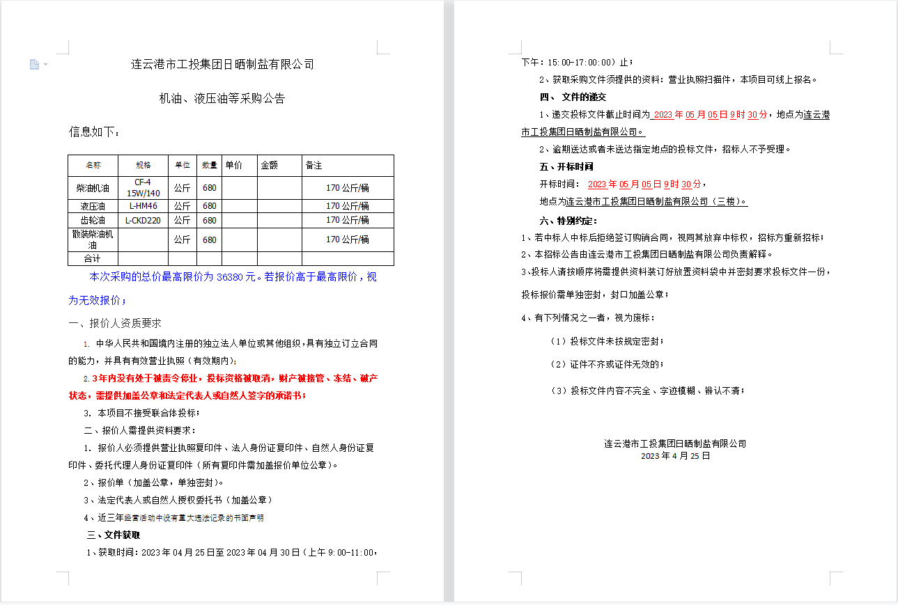 連云港市工投集團日曬制鹽有限公司 機油、液壓油等采購公告