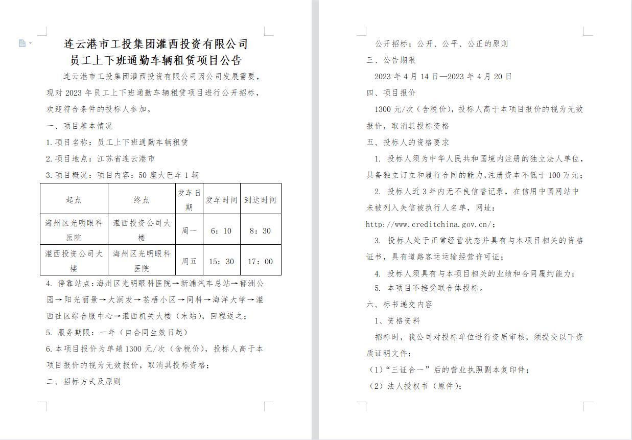 連云港市工投集團灌西投資有限公司 員工上下班通勤車輛租賃項目公告