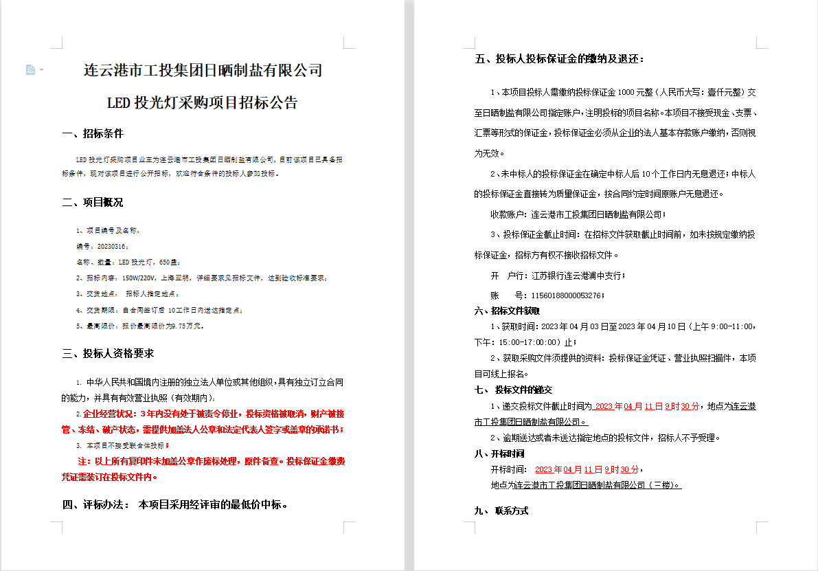 連云港市工投集團(tuán)日曬制鹽有限公司LED投光燈采購(gòu)項(xiàng)目招標(biāo)公告