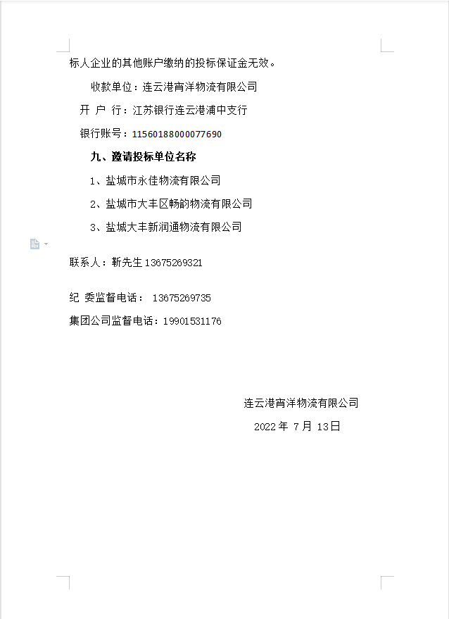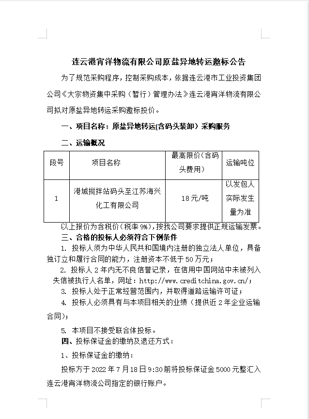 連云港宵洋物流有限公司原鹽異地轉(zhuǎn)運(yùn)邀標(biāo)公告