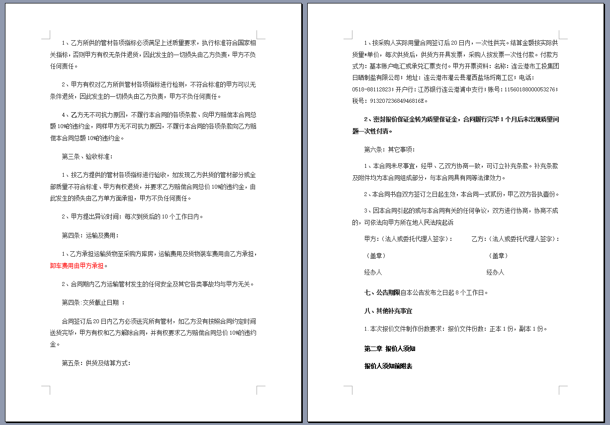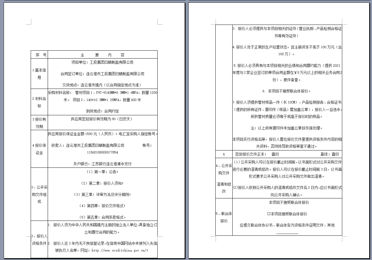 連云港市工投集團日曬制鹽有限公司管道采購項目 公開采購文件