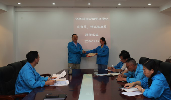 為進一步加強黨風廉政建設,拓寬監督渠道,構建黨內監督、行政監察與群眾監督相結合的監督制約機制,7月7日,我公司在二樓會議室舉行黨風黨紀監督員、特邀監察員聘任儀式,黨委書記、董事長、總經理朱桂玉為盧明江、徐元等6名黨風黨紀監督員和徐永亮、陳東等6名特邀監察員頒發了聘書。(金宣 金紀)