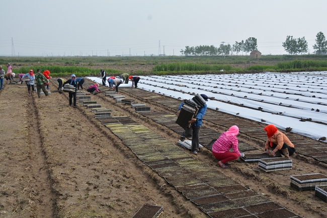 種糧大戶俞正猛正在張羅工人們擺盤育秧。運(yùn)盤、擺盤、覆膜、壘土,工人們或快速或仔細(xì)地高效運(yùn)轉(zhuǎn)著,三輛三輪車前后停在田埂上,車上整齊的擺放著數(shù)以萬盤的暗化苗,這些暗化苗來自生態(tài)種養(yǎng)中心育秧大棚,硬盤里面一層軟盤放入基質(zhì),撒入稻種,在大棚里通過一定的溫度和濕度的科學(xué)管理,出芽后運(yùn)送到各個(gè)田頭。男工負(fù)責(zé)把硬盤在秧板上均勻放好,再由心細(xì)的女工把軟盤從硬盤上拿出擺放在秧板地上,一條秧板擺完,立刻蓋上無紡布薄膜,就地挖土壓住防風(fēng),保護(hù)好秧苗不被曬傷。空的硬盤運(yùn)到田邊由專人整理回收最后運(yùn)回生態(tài)種養(yǎng)中心。全部擺完以后上好水,一整套工序就算完成。不到一天時(shí)間,一萬多盤秧盤已經(jīng)被工人們?nèi)粩[完。
