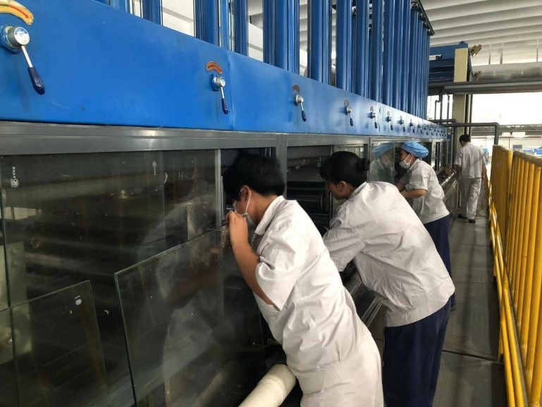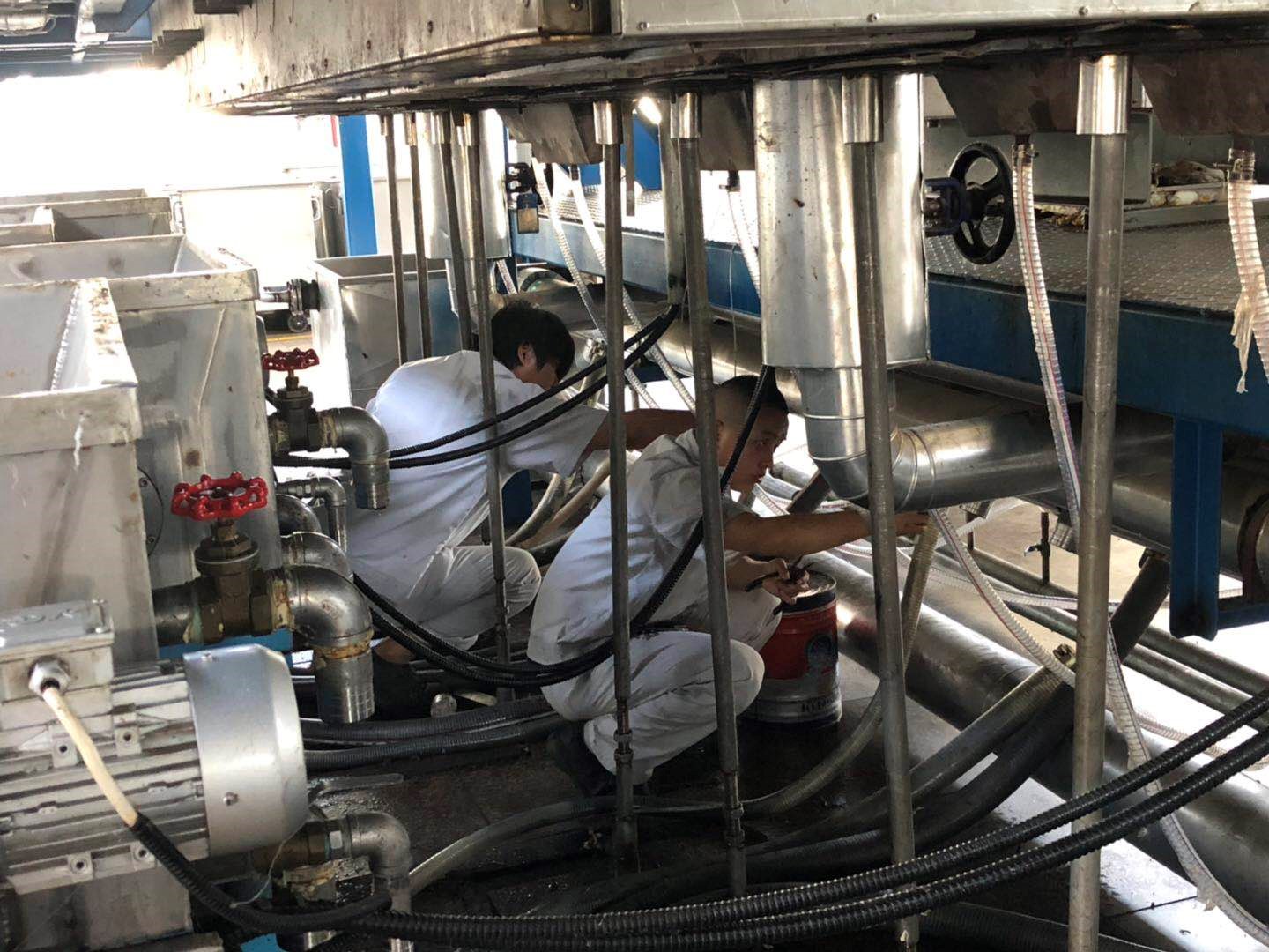 開展生產線設備清理工作。后紡員工無懼炎熱天氣,擼起袖子加油干,面臨萃取機內部空間狹小難清理難題時,身材精瘦的員工爭相進入萃取機內部進行清理作業(yè),形成“愛企奉獻”工作氛圍。