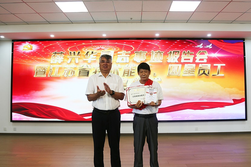 報告會上,公司總經理卞霄宣讀了《關于增評薛興華同志為“四星級員工”的決定》和在全公司范圍內開展“向江蘇省技術能手薛興華同志學習”的活動通知。公司黨委書記、董事長王德志為薛興華同志進行了現場授牌頒獎。