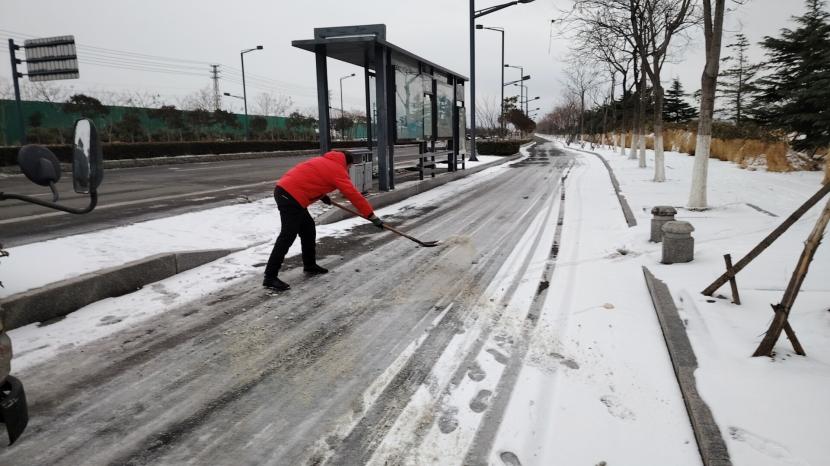 “融雪劑拋灑的時候要均勻拋灑,不要成團堆積,這樣不僅融雪的效果不好,還會浪費物資。”預備黨員武新忠一邊說著,一邊示范著給其他隊員。哪里的積雪最厚,哪里就有他們揮鍬鏟雪的身影。在融雪劑不能及時送達的情況下,他們就使用人工除雪的方式,不斷檔、不離線、不缺位的清除路面積雪,保證路面不出現積雪狀況。為堅決完成上級“雪停路凈”的掃雪除冰任務,他們不畏嚴寒,冒著風雨冰雪,晝夜不停,連續三天奮戰在掃雪的一線!以雪為令,雪不停,掃雪不止,一直堅守在掃雪工作中,有效清除了區域內的積雪,確保了交通道路的安全暢行。