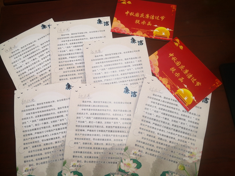 溫馨提示函早提醒。值此中秋、國慶佳節來臨之際臺北投資公司紀委向您和您的家人致以親切的問候……時時警鐘長鳴,處處廉潔自律,過一個幸福祥和的節日!節前,公司通過廉潔提示函黨員領導干部贈送節日廉提醒,將廉潔過節的紀律要求融入節日祝福。