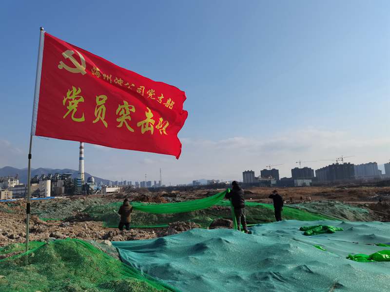 1月20日,在臨達公司330畝貨場的一處“山丘”上,一面鮮紅的海州灣黨支部“黨員突擊隊”旗格外引人注目。當天中午12時,聽聞兄弟單位臨達公司急需人手苫蓋防塵網,支部書記劉天義一聲令下,海州灣“黨員突擊隊”立即集結,穿戴好勞動裝備,奔赴環境整治“主戰場”。
