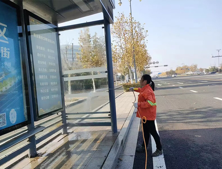 該分公司百余名一線保潔人員,無懼徐圩初冬低溫天氣,道路兩側,公交站臺,三人一組,兩人一對在班長帶動下,揮動手中大掃把,上下擺動拖把,人工清掃輔道落葉2000多米長,清洗站臺30多個,徒手擦洗座椅60多個,清倒果皮箱200多個突擊轉運園區施工垃圾300袋,有力保障途經道路環境整潔靚麗;大型車輛整裝待發,持續三天加班加點,7時許準時加滿車廂用水,安全有序到達指定路段,20臺大中型清掃沖洗車輛作業臺班達4個以上,為成功完成此次大保障有力彰顯機械強大功能。