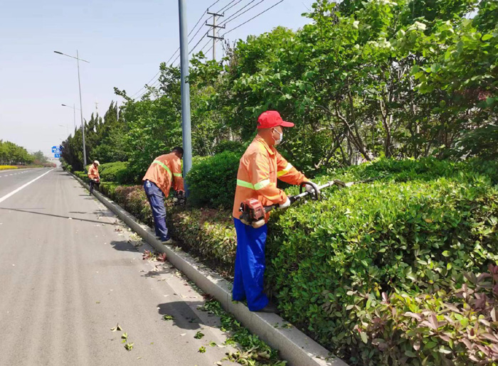 ????? 強化綠化修剪。結合季節特點和植物生長習性,對行道樹及綠籬展開整形修剪,及時去除枯死枝、折斷枝、病蟲枝及下垂枝,確保樹形優美,生長態勢良好。本著“除早、除小、除了”的原則,對枯草雜草及時清理,防治雜草與園林植物爭肥、爭水,確保苗木生長旺盛。